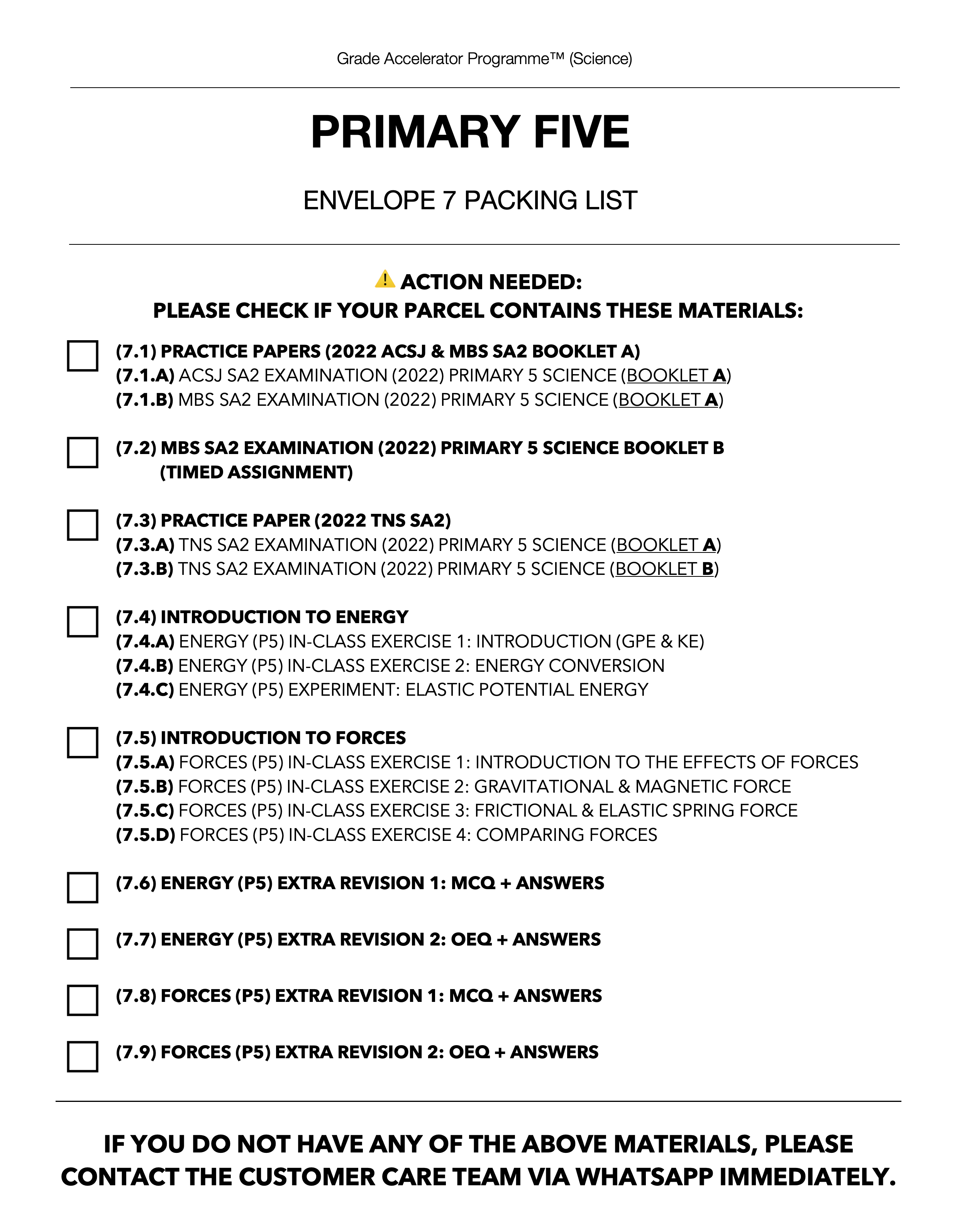 Please reach out to our Customer Care team via WhatsApp message or call if you are missing any materials.