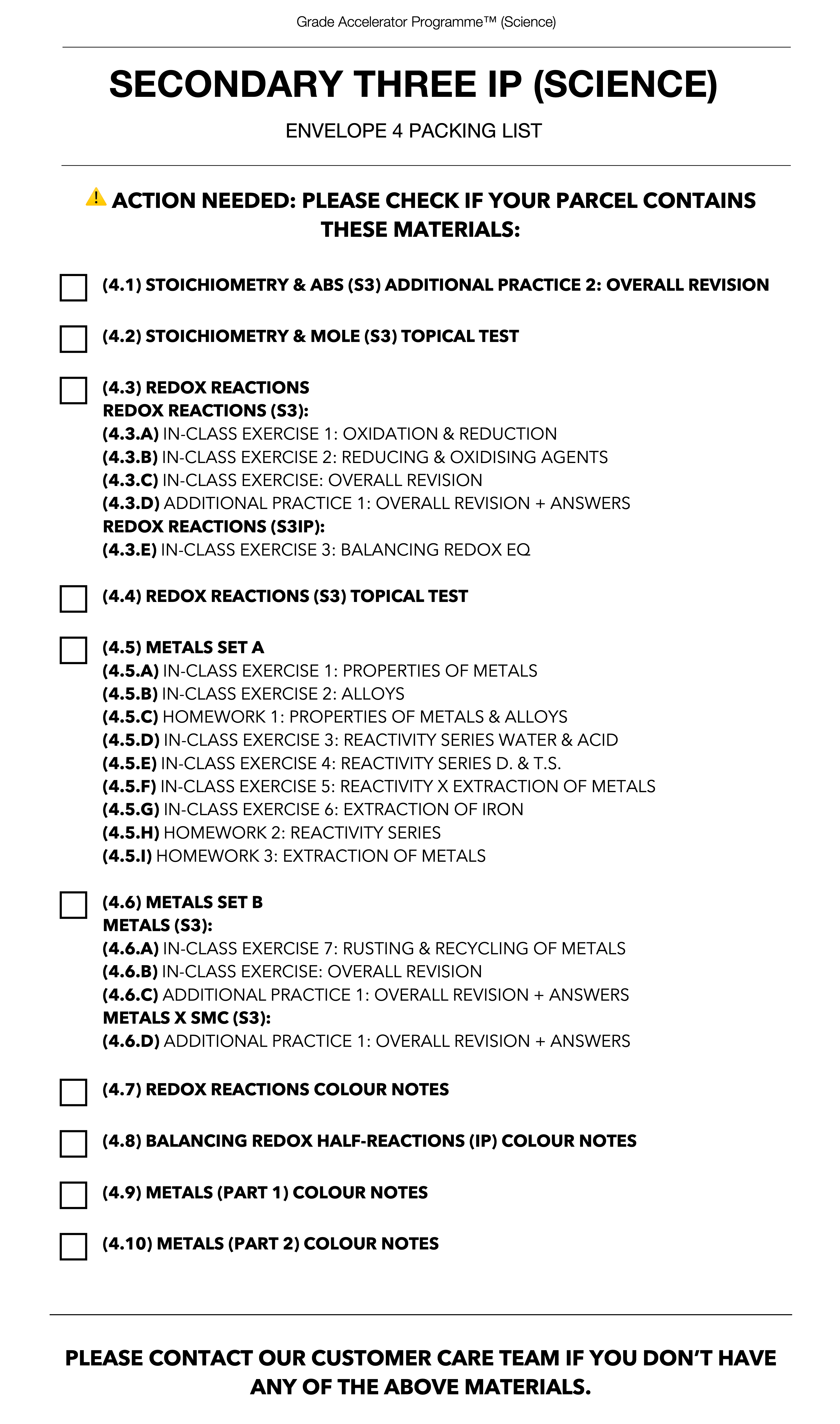 Please reach out to our Customer Care team via WhatsApp message or call if you are missing any materials.