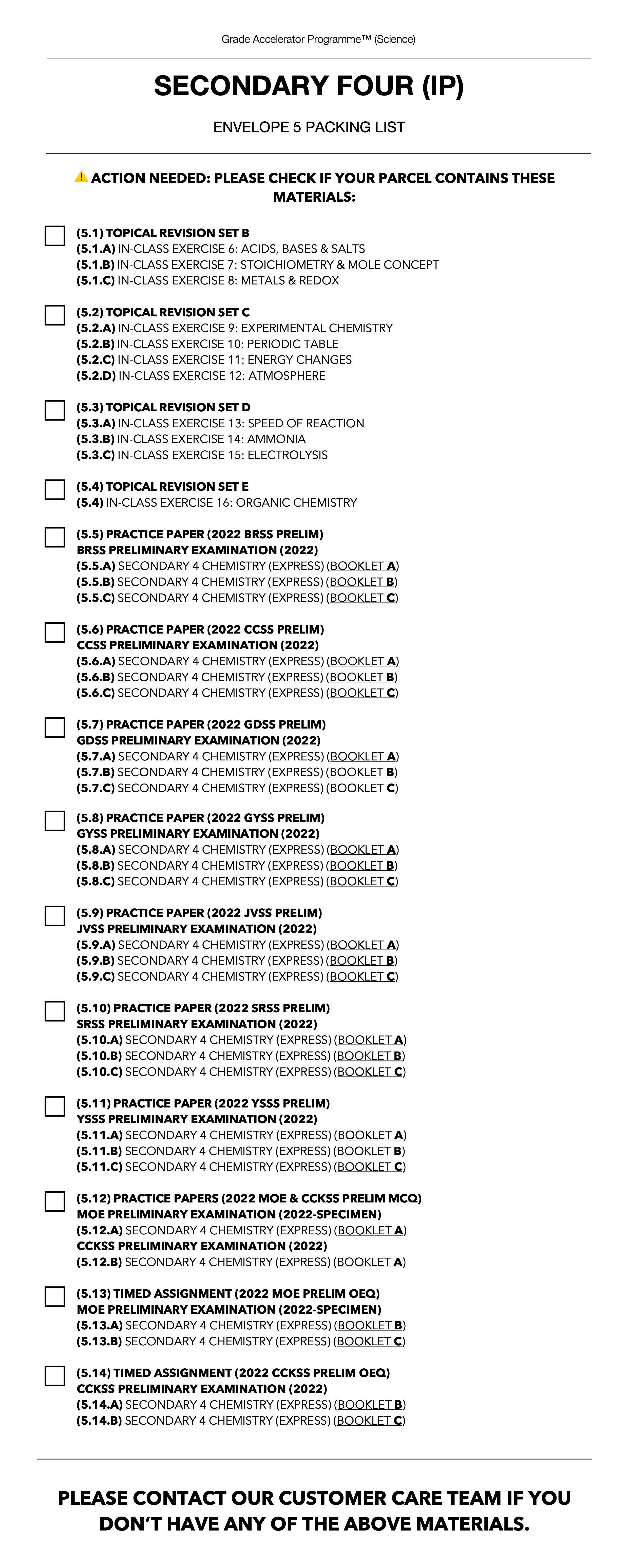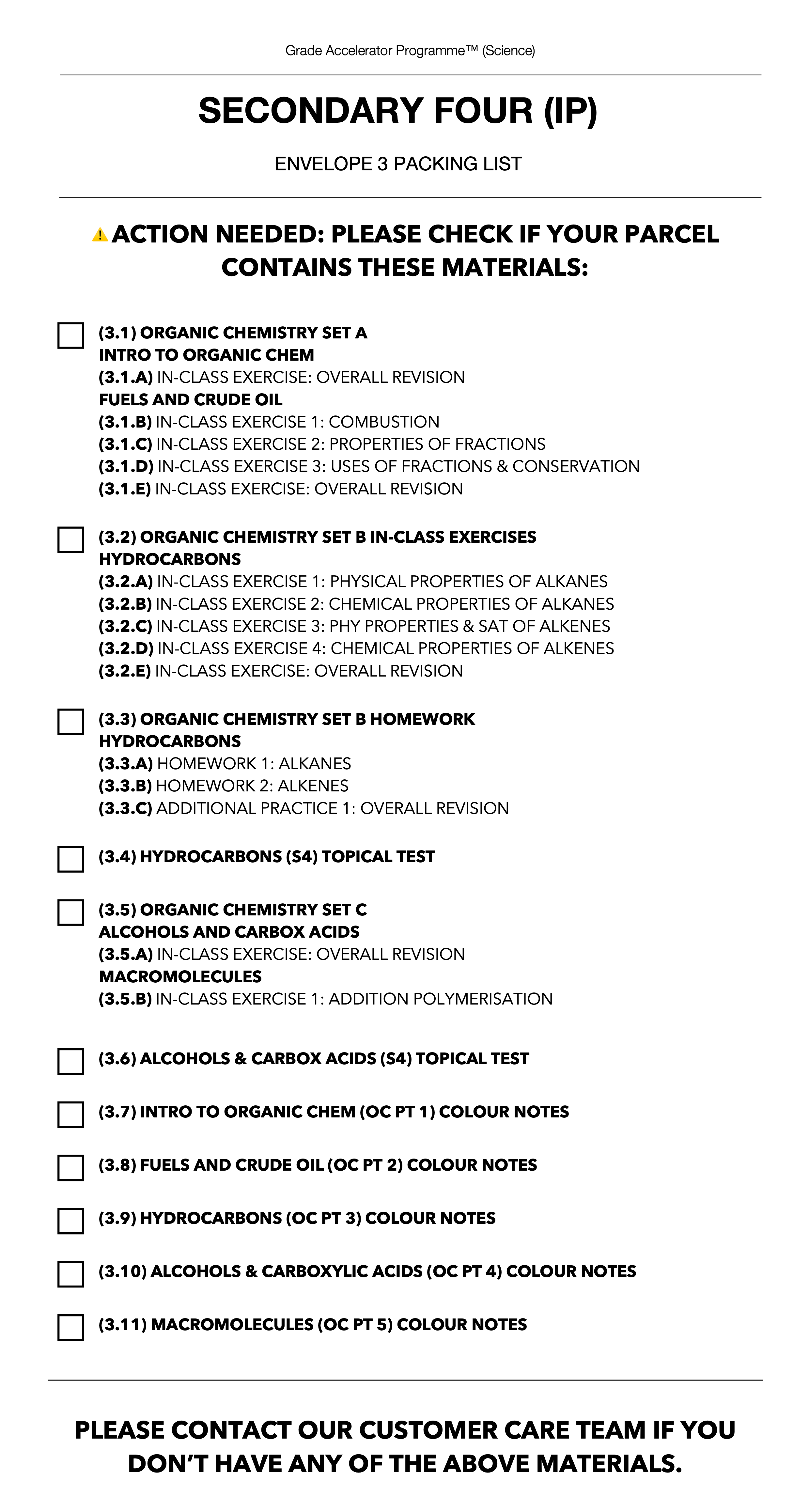 Please reach out to our Customer Care team via WhatsApp message or call if you are missing any materials.